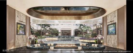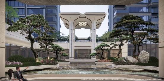 二进“静谧之庭”,下沉庭院荷池盛景构成核心景观。中海复刻古南池人文盛景,以叠水景石、荷风奢亭构筑诗意谧境。