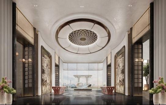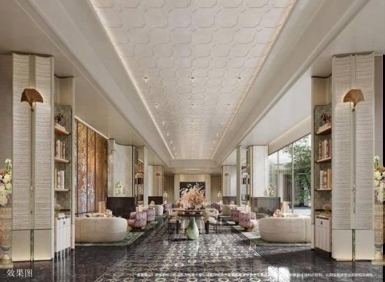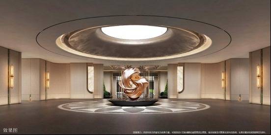 如归家大堂室内大厅,天花提取荷叶脉络,演绎成层层绽放的莲纹,地面拼花则解构荷花的阵列,重构为中正对称的玉阶纹样,传承东方园林 “曲水流觞”的雅趣。墙面采用山东琉璃工艺,将荷花形态与城市会客厅的人文图景相融,取“天圆地方、星辰有序”之象。